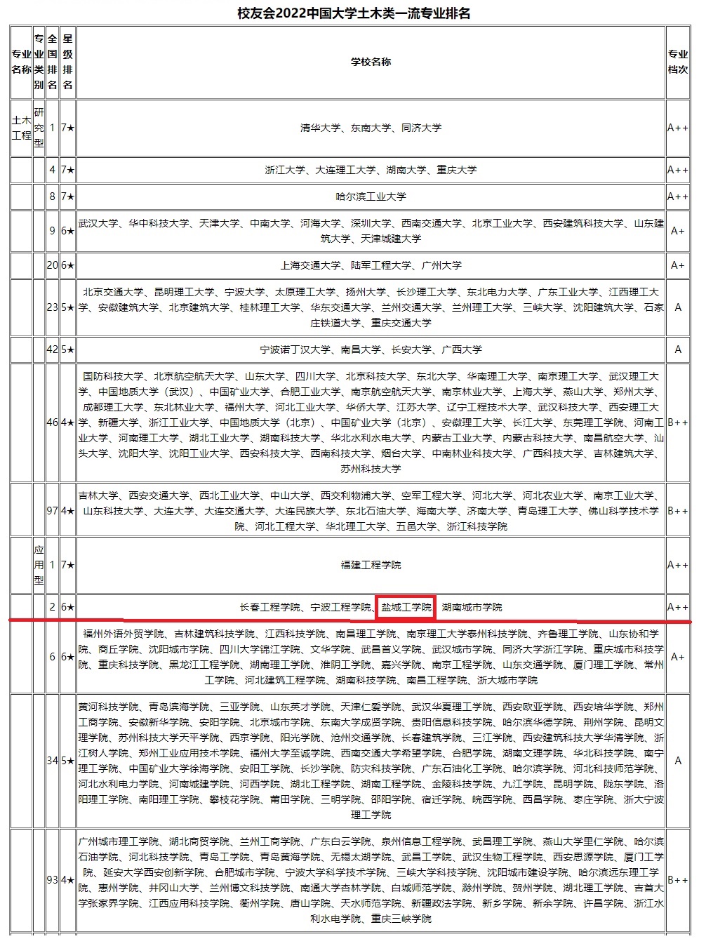 近日,校友会2022中国大学一流专业排名正式发布,土木工程学院土木工程专业位列全国应用型专业第2名,江苏省第1名,省内唯一一个A++档次专业,凸显了我院土木工程专业的引领地位。另外,学院给排水科学与工程和建筑学专业均为为应用型4星专业,分列全国第9和第34名,均为B++档次,在国内应用型专业中表现出较强的竞争力。