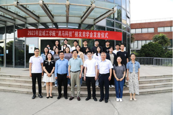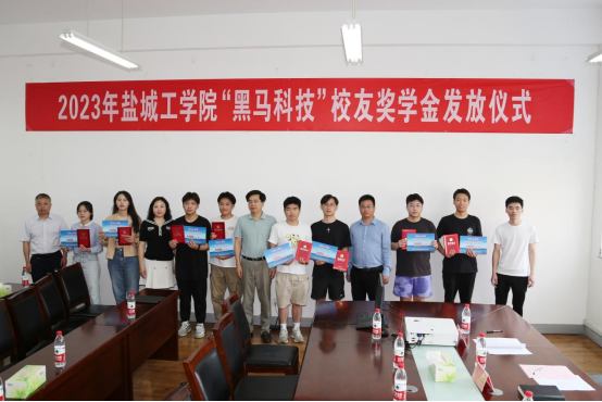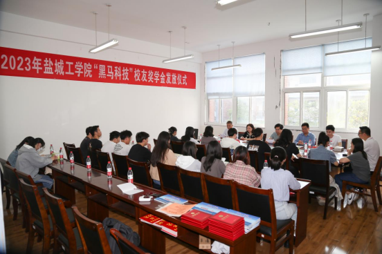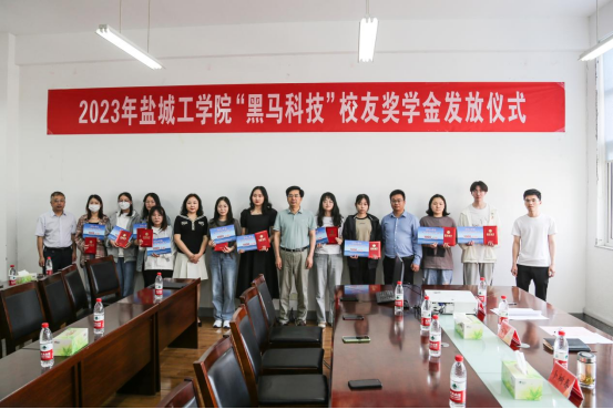 祁娟宣读《盐城工学院第一届“黑马科技”校友奖学金评审结果》,参会嘉宾为18名获奖同学颁奖并发放学习用品。
